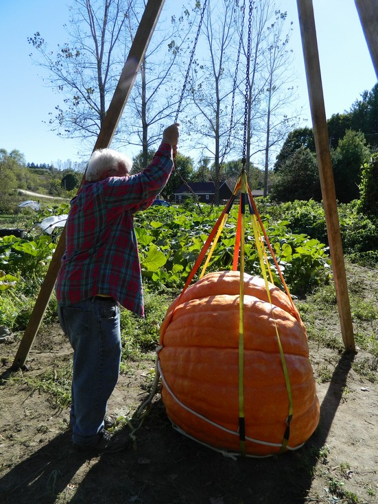 My pumpkin so I have to do the muscle work. If I grow one any bigger I'm going to get a 2 ton hoist with a better gear ratio to make the lifting easier.