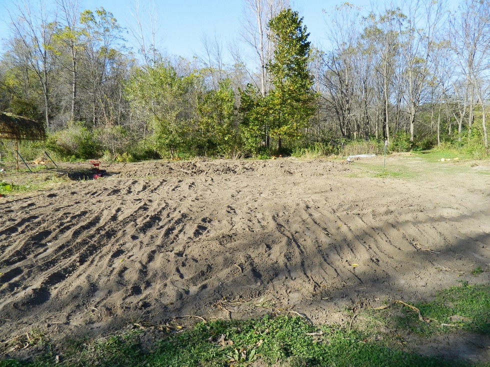 I use a rake and the tiller to level out the soil piles without compaction. You can see one area that has been worked and another one that needs leveling. It is hard work but I am doing it a little at a time. Jacob can help if he wants to grow next year. Now I need to get a soil test. I plan to add manure, compost. leaves and rye cover crop this fall. In the spring after it settles I can till and re-level and add any additional nutrients.