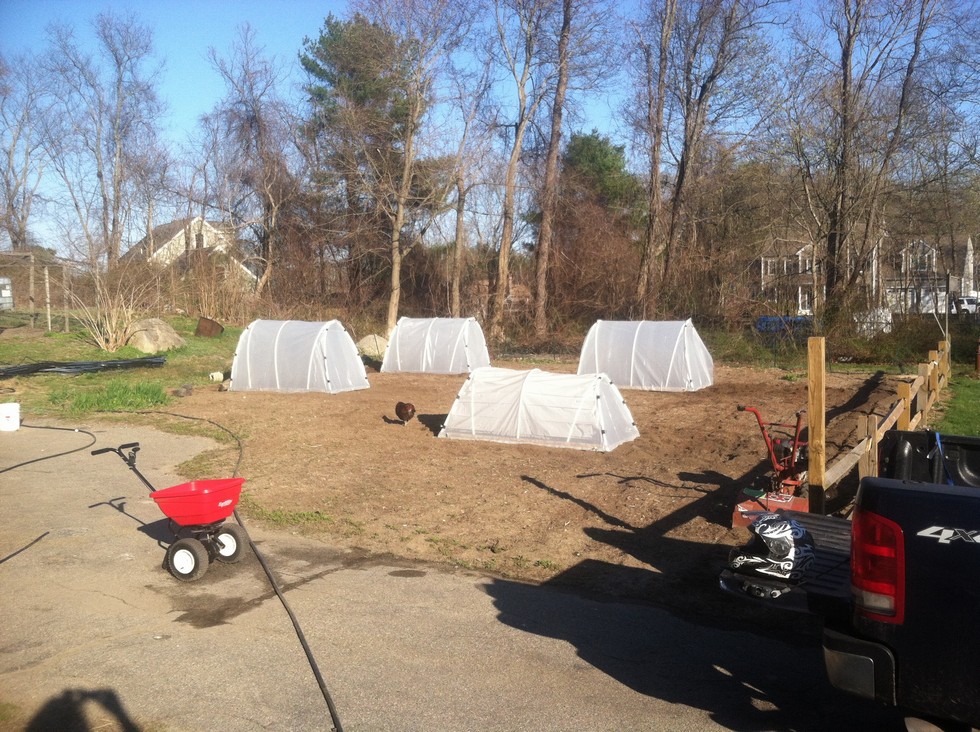 Hoop hoses fixed and in the patch. Monitoring for soil temps. I am going to try filling a black plastic garbage bag with water and see how it affects the hoop and soil temps over night.