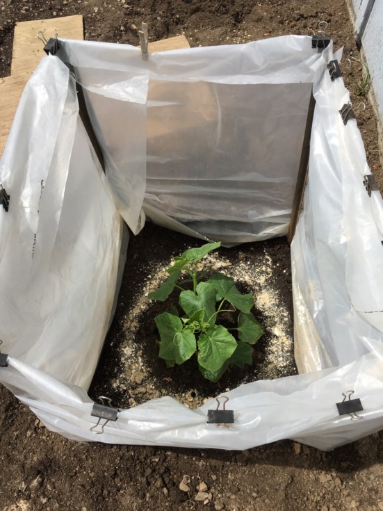 Windbreak for the cuc. I think she will outgrow that in a few days! Okay! We are done for today! Pete can relax and watch some basketball. Tomorrow I am hitting the tennis court! We got a lot of work done this week and today! We hope those pumpkins grow, grow, grow!