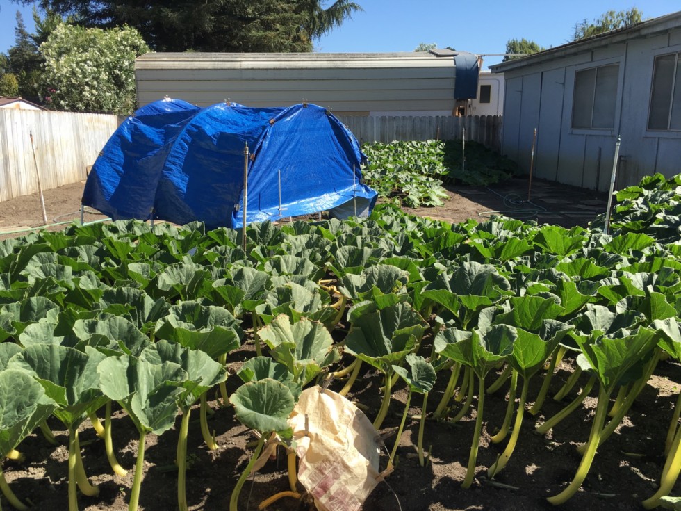This is what is left of the 2145 McMullen plant. The pumpkin on this plant grew 10 inches over the last two days. A LOVELY barrel shape. I named her Sleeping beauty as this plant started off SO SLOW it was a sleeper. We were just starting to see the plant filling out when we discovered the soft area on the main. Now she will be an experiment to see how much plant is needed to grow a pumpkin. So heartbreaking.