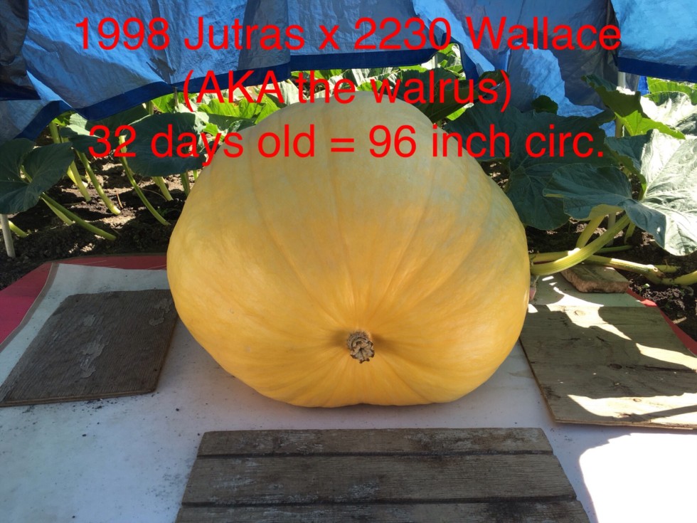 The pumpkin on the 1998 Jutras. This plant has lots of troubles. Stump had soft area early. We have found another couple of soft rotty areas on the main. We have scraped, sprayed , tented areas and hope for the best. She keeps growing 8 inches every two days. She will be very orange and have a great shape. This one will keep us awake nights.