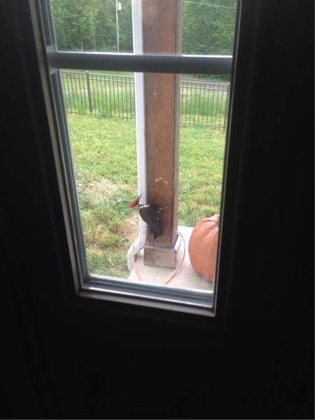 Caught this crazy woodpecker pecking my front post again. He was after carpenter bees last year, so they must be back.