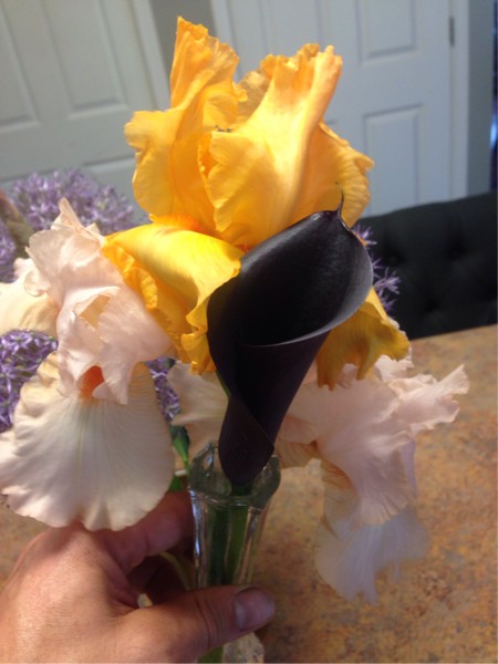 Did a little weeding today and found these :) German iris and Calla lily. I have a near black iris that I was trying to pair with these but the bloom time is a little off. I sure do LOVE orange! Alliums in the back of the vase.