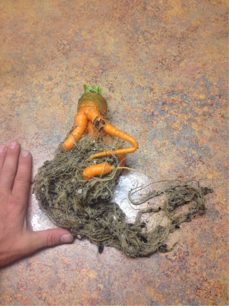 Pulled one of the runty carrots just to see what was going on and it's no wonder it wasn't happy in that 3 gal pot.