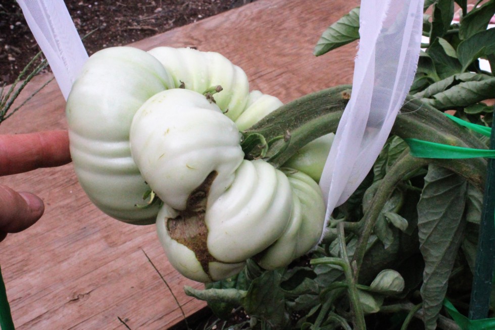 5.55 White AKA the Kraken around 34dap. After about 10 days of really high heat, many of the tomatoes really slowed down and this one was no exception. Only growing at 0.25"/day at most during this time. Now cooler in the '70s most tomatoes are picking up the pace again. This one grew 0.50" last night for example. May not get to be a world record but is still a Kraken to me!