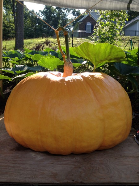 My dearest Patience at 37 days old, 104" cc. Front to back is now 2" different than side to side as the back half is going just a little harder than the front. We saw this express itself at a very early age, and continue to further exaggerate itself as the growth picks up. Still relatively level on top, stem is holding up well. Ran out of room on the 4 x 4 platform for the vine incliner so it was removed yesterday. This reaffirms that I want to use a longer platform next year. Idea to tie vine from above was borrowed from the original Cinderella man, Mr. Zunnio. Thank you sir for your diary, it was inspiring to say the least!
