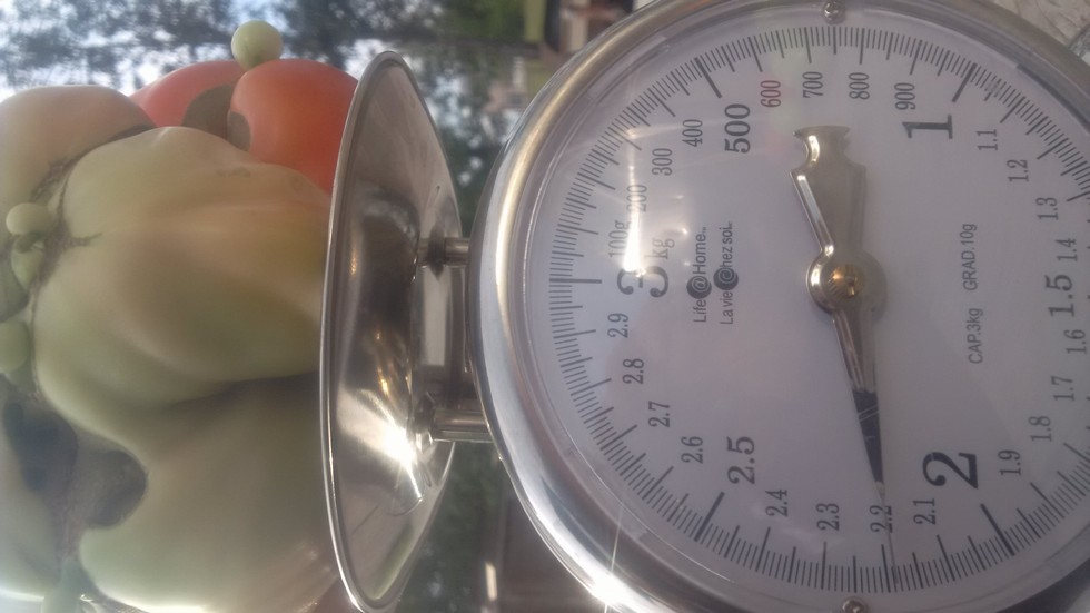 Here is my biggest tomato at 2.185 kgs or 4.817 pounds