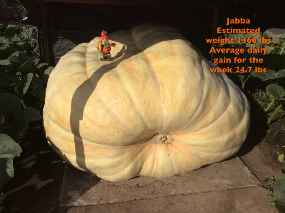 Jabba is doing great and will be turning 60 days old Tuesday. She's definitely a contender for a new state record which is currently 1659.5 pounds. She needs to gain 300 more pounds. With 34 days left till Walhalla's pumpkin fest, she would need to gain an average of 8.8 pounds a day. 7.3 pounds a day when I take it to Minot. It would be nice to do it right here in Walhalla but the pumpkin contest here isn't a GPC (Great Pumpkin Commonwealth ) sanctioned event. I could also take it to Stillwater Minnesota and give it a total of 48 more days of growing time.