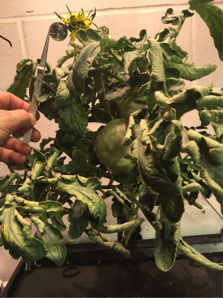I might have a difficult decision to make in a few days. My aeroponic plant has a 14.5 inch 18 DAP tomato on.. yes :) goal achieved ..over 1/2 pound. I have this little mega just opening. Looking at the stigmas..they are in a 3/4 inch line with two 1/8 inch perpendicular attached stigmas, one up and one down. I am guessing this will turn out to be at least five fused. If this blossom sets (right now this blossom and another are not dropping enough pollen to guarantee a full set) should I stick with the 18 day old or cull it and go with this one..i have much better root system now then when the first blossom was set. By the end of this weekend, I should have made my decision.