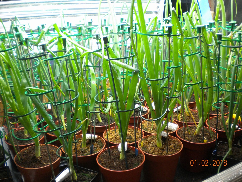 Onions are still growing under supplementary lighting for 10.5 hrs in my greenhouse cabinet, potted on the best into 7 inch round pots with higher supports. The larger plants in the foreground are in Coco compost, others in peat/soil