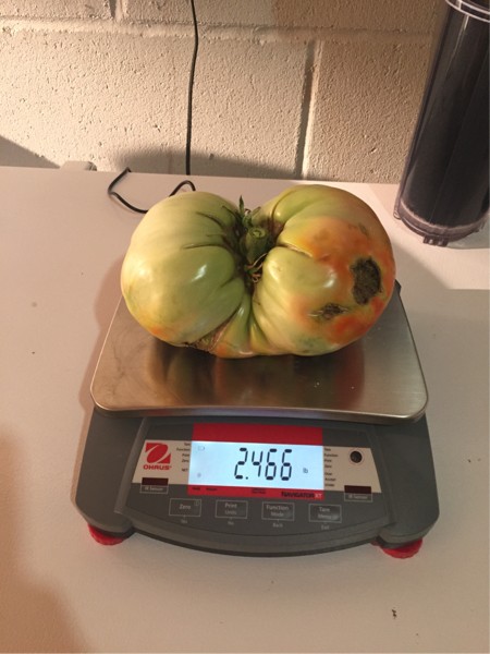 Indoor garden rearrangement today. First thing to do...pick my early entries. The first on the scale was the aeroponic tomato. I was hopefull..it measures nearly the same as Dan's three pounder at 20 1/8 x18 x 14. The scale weight wasn't the same. 2.47 pounds for an Mfactor of .00049 . Still for first try at aeroponics I have to be satisfied.