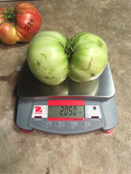 The second I picked was worried that it wasn't going to get over 2 pounds. It was the youngest set..at only 34 DAP. This tomato never had BER. That might be why it came in with an mFactor of .0005, weight of 2.05 pounds.