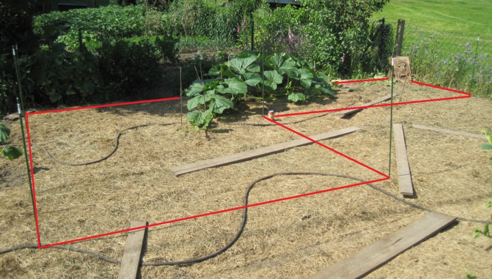 150 sqft contest plant, still plenty of room available, and it looks like the vines are friendly and adhere to my proposed vine pattern. Also, I�ve discovered a female in the main vine tip (it�s the 3rd female of this plant already), which should end up in a position close to the proposed spot and it should open somewhen in 9 - 11 days (time will tell). Also, the first male opened (good news, the plant is not sterile). This time I took care and positioned the size reference can somewhere in the pic :)