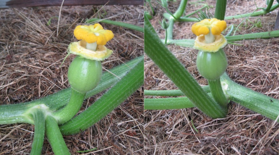 Is this my dear Elphaba? This morning I haven�t been at home, therefore this was an open pollination. However, she�s a beauty and in a perfect position (main vine somewhere at 13 ft). It would be my earliest pollination ever, but the plant is doing fine, it has at least 16 secondaries between stump and fruit which may be retained while the fruit grows, and I know that every day counts (in 2014 we#ve had an early start of fall in the middle of August), and the next decent female will open in 4 or 5 days, I guess. So if this one takes, I�ll go with growing this open pollinated one for weight, and for genetics I�ll perhaps grow a selfed one on a secondary. Time will tell...