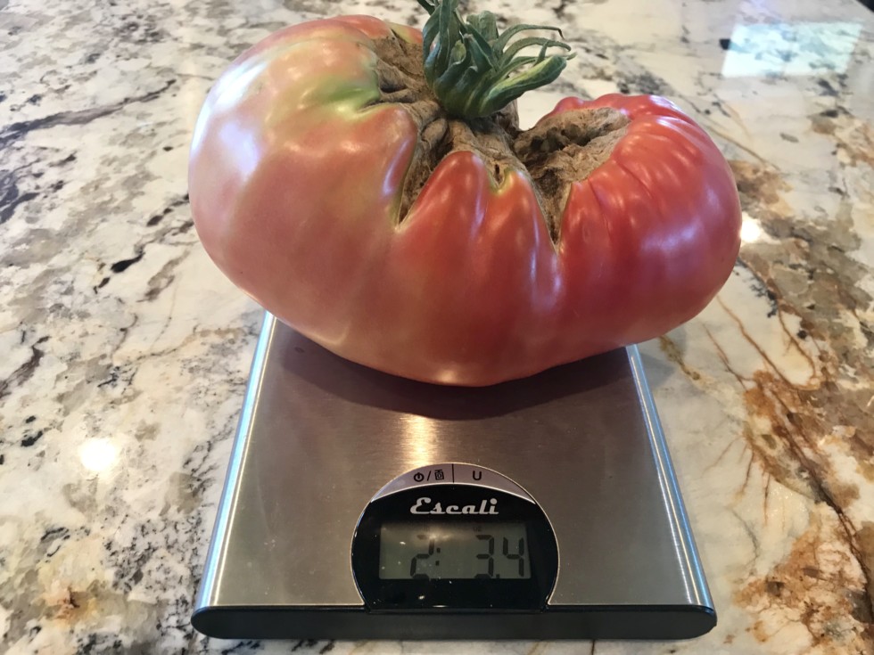 One thing I don't love about this tomato that I noticed while it was growing is that it started separating from the stem as it grew. So the larger side of the tomato was still firmly attached to the stem but the tomato must have grown so much that the smaller side grew away from the stem. The smaller side turned red first.