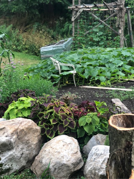 The back patch is no slouch this year either...couple of youngsters snapped off the main while trouncing through the garden during our Fourth of July party...guess we are going with that fruit...and check out lambchops coleus she started from seed...pretty impressive