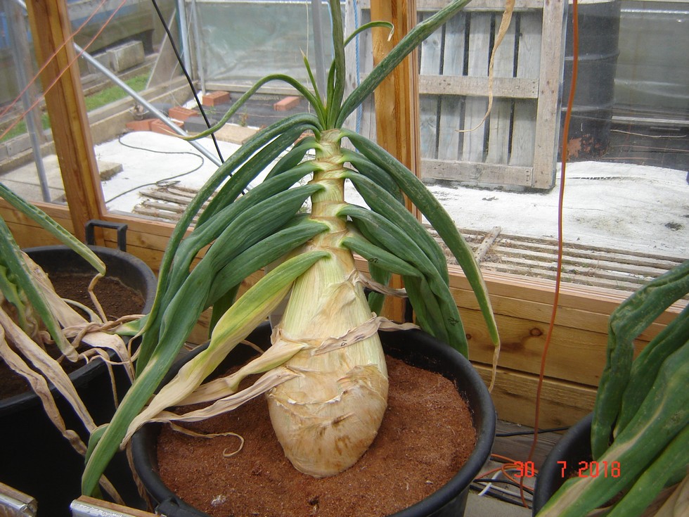 High shouldered bulb with greener foliage, but not as large a circumference. This is growing in Coir compost and generally these plants have fresher tops.