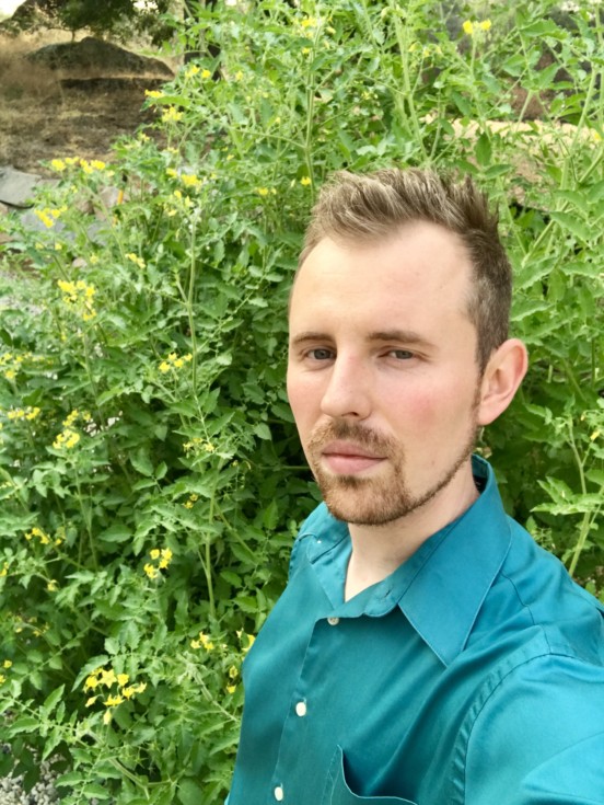 selfie with the cherry tomato. The planter it is growing in has TONS of wood ash in it.