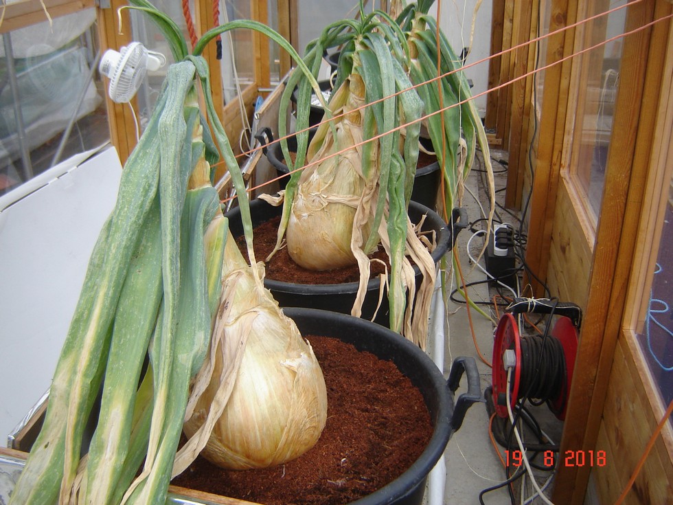 Onions giving up and only slow growth in circumference now. These ones are in Coir growing medium and are fresher than all the soil grown plants.