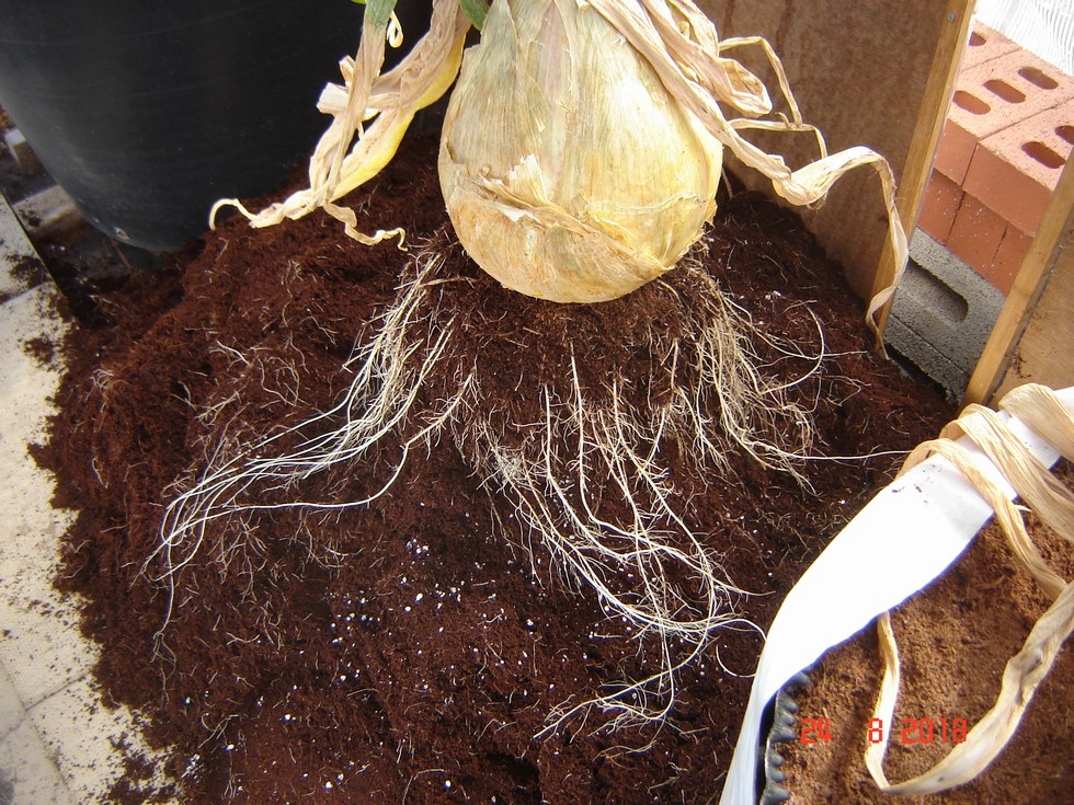 Lifted Onion for tomorrows show, growing in coir inside air pots and the white root system amazing. Bulb weighed light perhaps due to the very hot growing temp's this year.