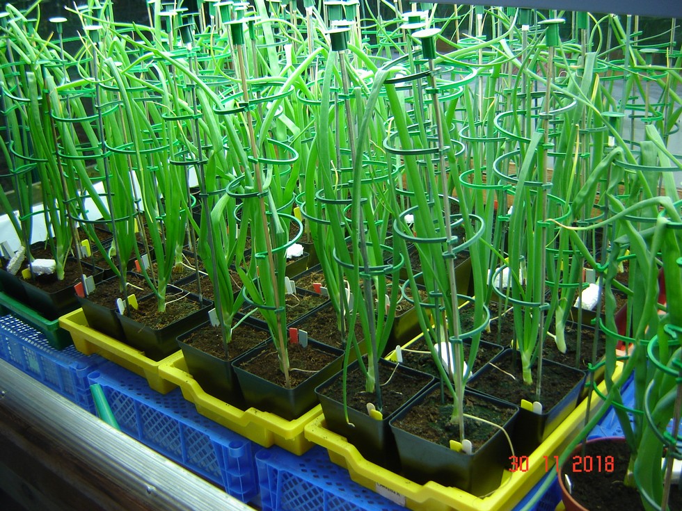 Onions growing away in their greenhouse cabinet, under 10hrs daytime T5 lighting. Well on for early Dec. and may be a space problem when potting on later.