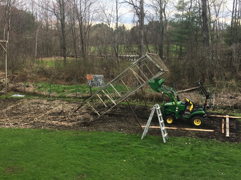 Saturday Kerry and I tried to move our 16 foot trellis by ourselves. This is the outcome after we dug it up, tried to lift it out of the 20� deep holes and watched it tip over nearly killing us! LOL We set boards under it and dragged it 25 feet to its new hopeful location. We quit for the night with very sore backs and decided to call in help for Sunday.