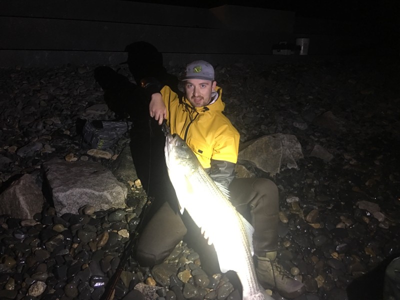 This is our son Parker with his new pet best striper at 44 inches. It was quite a battle with 3-4 foot waves. Both fish were released successfully so they can grow and give another fisherman some fun.