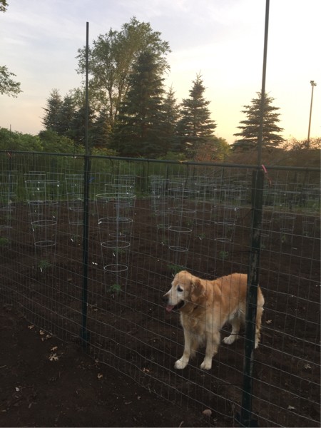 Most of the deer barrier is up. After I string the top 3 ft I will have an 8 ft tall obstacle. Why is my dog in the garden...no fence has ever stopped him. I think he went thru the gate.