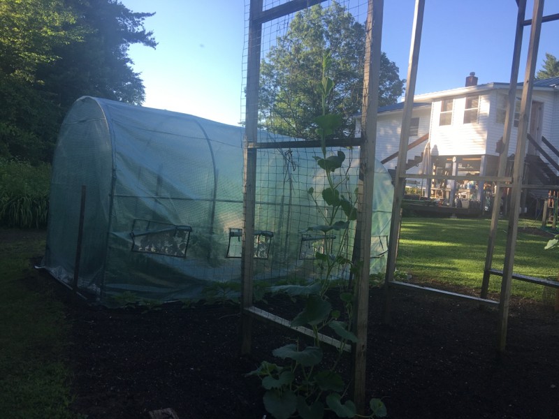 132 Young long gourd is starting to climb quickly and is 7 feet up the 14.5 foot trellis.