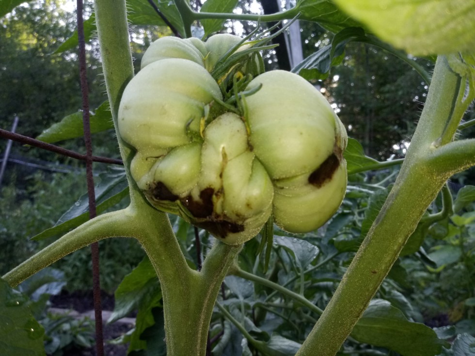 Well it looks like we won't get to know how big the climbing triple crop. Tomato will get ? After 3" of rain over the weekend has caused BER to it !!! Not suprized my ground is over saturated again.