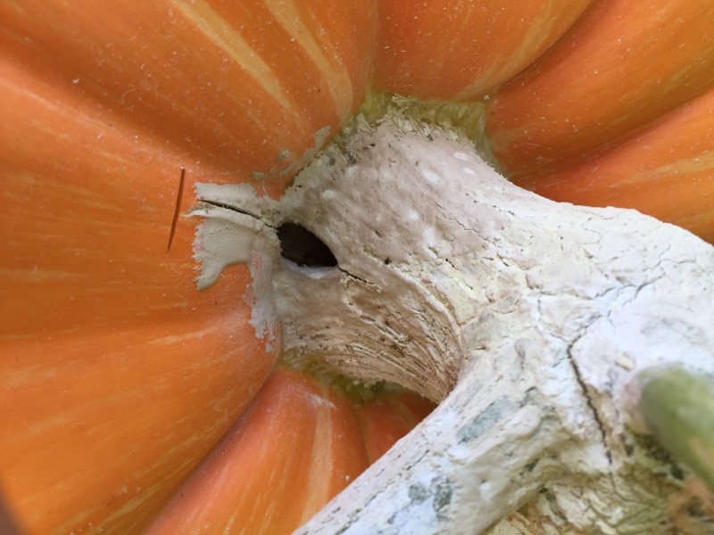 I cut the stem from the split toward the main vine, I cut extending the split in the pumpkin & I did a transverse cut in the pumpkin flesh beyond the split cut.