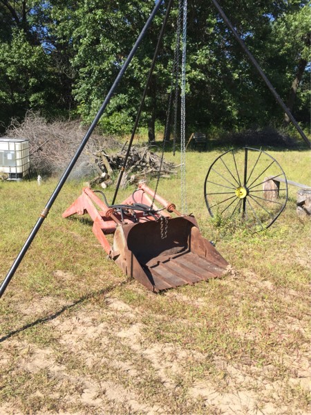 The bucket for the allis came home yesterday. This tripod is getting a workout this month. I can�t believe how easy this to set up. I put 10 ft legs on it and then lift it upright. I only weigh about 125 pounds. Once it is upright, I add 4 ft leg extensions to it. Takes but minutes to get it all done. I should be able to load a 2000 pound pumkin much easier now than I have ever loaded my small ones. The challenge now will be to grow something big enough that I wonder how to load it again.