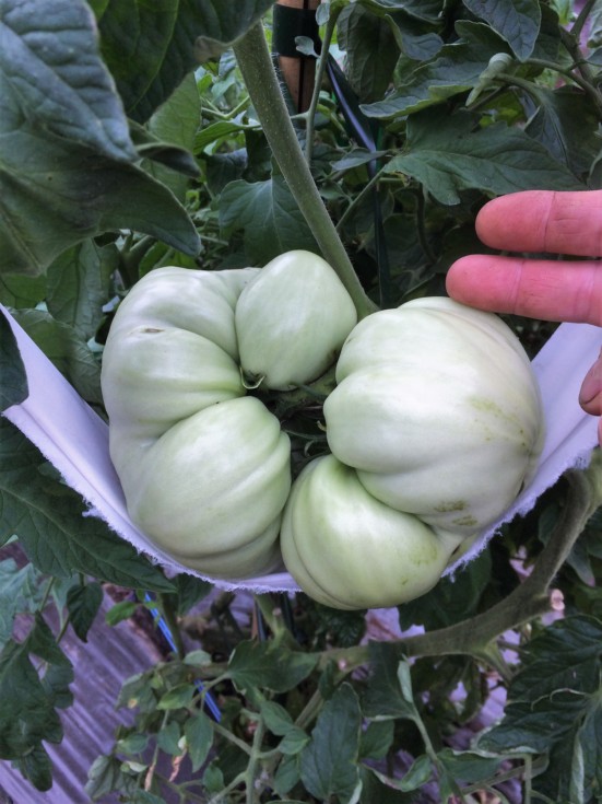 Just a sampling of the many hammocked tomatoes growing. This random one is one of the nicer Delicious tomatoes I have going, from the 3.72 Hendersen (5.96 Treece). Currently 21.50" and 30 dap. Have at least 20 more days to go! A little scary as the one stem is split down the middle, one half going to one side and the other half going to the other. As the tomato grows the split keeps splitting down the middle. The tomato is totally fused.