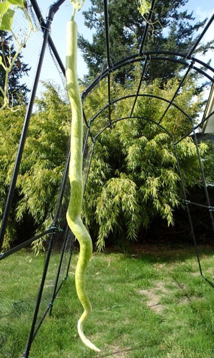 Are you ready, #1 Long Gourd of Lakewood? At 29 DAP, probably not! It's just too cold out there at night for you! You're all bundled up and coming with me, to the Central Market Weigh Off, where people will admire your corkscrew shape, swirled shades of green, and your #1 tattoo!