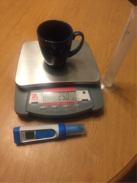 Getting ready to do a 1:1 soil slurry test. In this case I had to go 1:2. My media holds too much water to get enough liquid for probe depth. More soil would help for 1:1.My procedure- Pick a sample of grow media. Weigh it in grams. Add pure water(i use reverse osmosis)in same quantity, in this case twice as much.1 gram = 1ml. Stir and then wait. Then stir again and wait again...when i get tired of waiting, I will strain the mixture and then test the liquid with my Ph/EC meter. This will give me a general idea of where things are at.