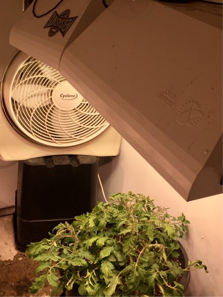 Since I have less plants in the grow room than planned, I have an extra light. I moved two lights closer together and now am getting 1000 umols on the entire canopy. This is without lowering the distance of the light, which would increase the heat and be a reduced foot print. 630 watts now over one plant. I also set up a bigger fan. Foliage is dense enough that I felt the plant needed more air circulation than what the little fan was providing. All in for the rest of the season.