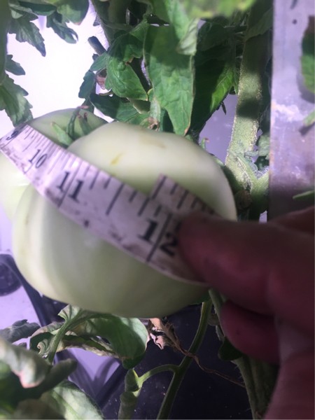 The hydro tomato is gaining size faster. In eight days it has gone from quarter size (maybe 3 inches cc?) to almost 12 inches. The diet i am feeding it is really hurting the foliage but the fruit seems to be responding. As long as it keeps getting bigger I will stick with this nutrient plan.