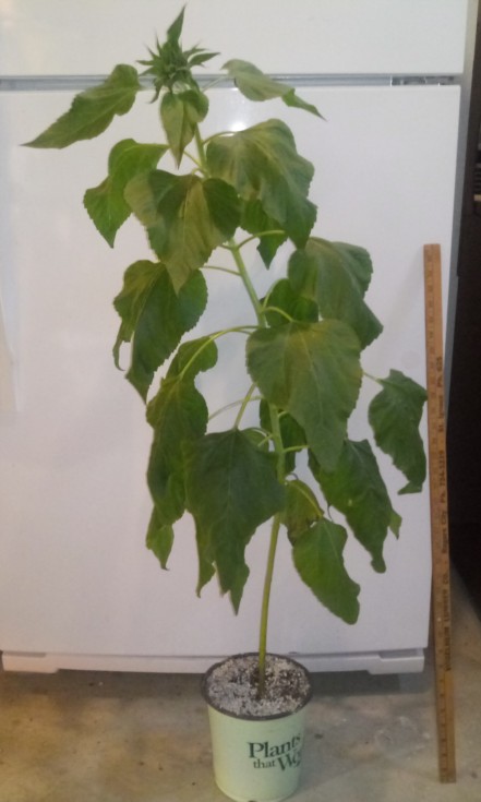 This sunflower plant is now 40" tall and still in a 1 gallon pot !!! This was only suposed to be a test to see how my new light would work then i never had the heart to throw it away when it got bigger. Now i can't wait to see it flower. I hate to see what would have happened if i had this in a 5 gallon pot ?