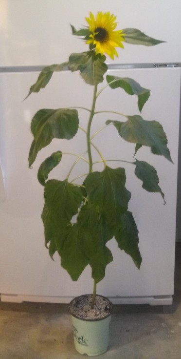Here is my indoor sunflower plant in a 1 gallon pot and 4 feet tall