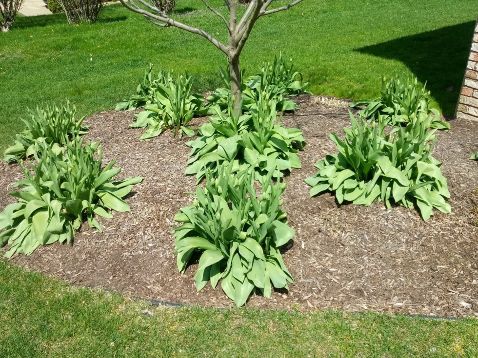 These tulips are a larger and later blooming veriety. 5 years ago i started each cluster with 5 bulbs. Now some clusters will have over 20 blooms this year