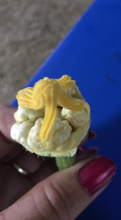 Found this weird male while pollinating my fourth and final female. I have three on the main and one on the side. The side vine pumpkin is the oldest by two days and of course is the largest at this time. I will terminate the main in a couple days and what sides are still growing have 4-5 ft to go then all will be terminated.
