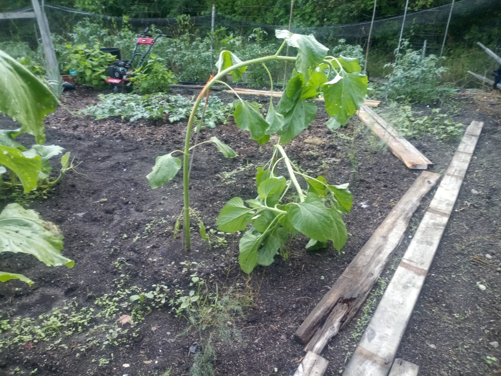 An isolated storm hit my garden yesterday and dropped about 1" of rain. This is not storm dammage its just the sunflower plants twisting on their own a surge of growth !!! This my become a big problem because i had no intention on staking these plants !!! These plants are allready 6 feet tall ?