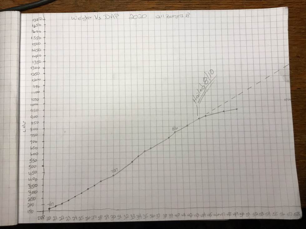 Growth curve is flattening out. Looks like 1000 may still be possible before 60 DAP, I sure hope so. Trying to resuscitate her a little, gave her a foliar of silica and Azos. Also worm tea plus Azos through the drip lines. Began watering again today for first time since the hail storm. Praying for a little jump in the lb/day. The remaining leaves look like shit and are riddled from the hail. Windy day yesterday broke over more stalks that had chunks blown out from the hail but were still standing after the storm. To be expected I guess. Suckers starting to shoot out all over, must be the opening of the canopy and sunlight having a direct shot. I was seeing some squash bug egg clusters just before the storm, so will probably follow up with a Neem application tomorrow. Still got plenty of roots, just so few solar panels to run the pump. Don't think they are going to hang on much into fall, so I have to get the most I can now.