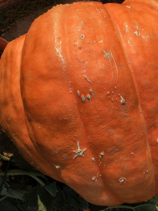 She is getting uglier as she grows. The scars grow with the pumpkin. This is on top which got hit a few times before I got her covered with big quilt. Hail stones must have been spinning fast, look at some of the "whirlpool" marks. Long marks are from the cat.