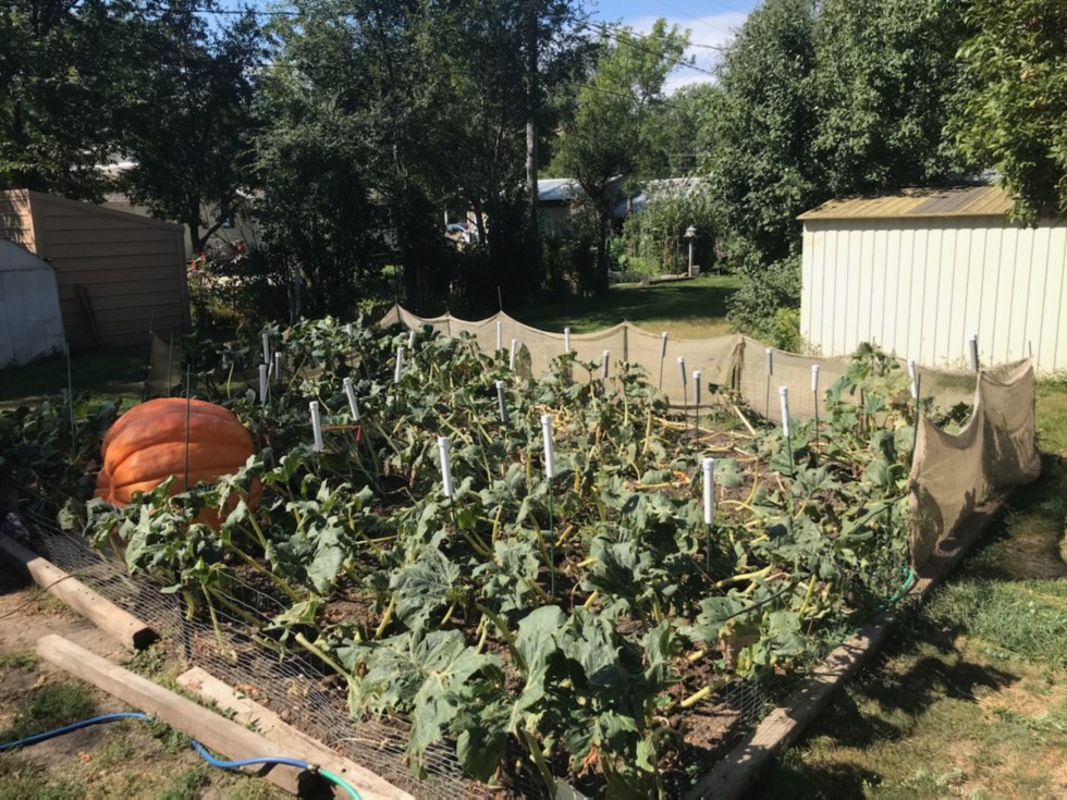 The next few pics are what is left of my patch. The Aug 10 hail storm did serious damage. Still putting on about 4 lbs/day now that it cooled down a bit. Several days in the 90's last week had her at a standstill for 4 days, but she has picked up again. Cooler nights on the horizon. Hard to get a good measurement, but she is north of 1000 by chart. I would sure like to see another 40-50 lbs before the Sept 26 weigh in at the Great Downtown Pumpkin Festival in Rapid City. Amazing how tough and vigorous these plants are, I figured my gains would be done after the hail storm. Would loved to have grown this girl out without the hail, leaves were beautiful looking.