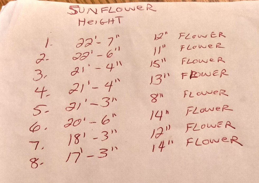 Well this is my list on how tall each sunflower plant was and the size of their flowers too !!!
