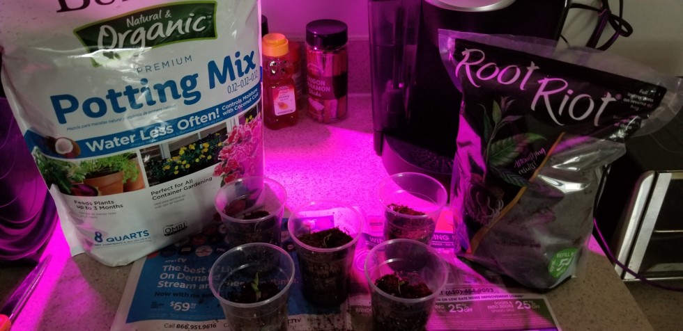 Big day for seedlings..tiny tots started in Root Riot left over from last year. I'm keeping this simple..spare cups maybe 8oz, 2 seeds per Root Riot pod, plant light, heat matt, and big portion of patience. Somebody in my house who shared their bad cold with me also shared his seeds with me...so I started some of those too...more to come. 55 today with clouds. At least he is not trash talking me this year. Told him to get on board the train and help me!