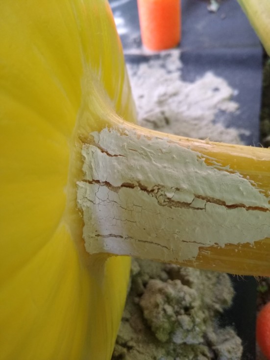 Have been treating a small split on the stem of my 2089 Thomson the best I know how. Added some Daconile with Dr and have a fan on it. Looks to be spreading closer to the pumpkin now though. Have a couple more on the vine but this one is a better location.