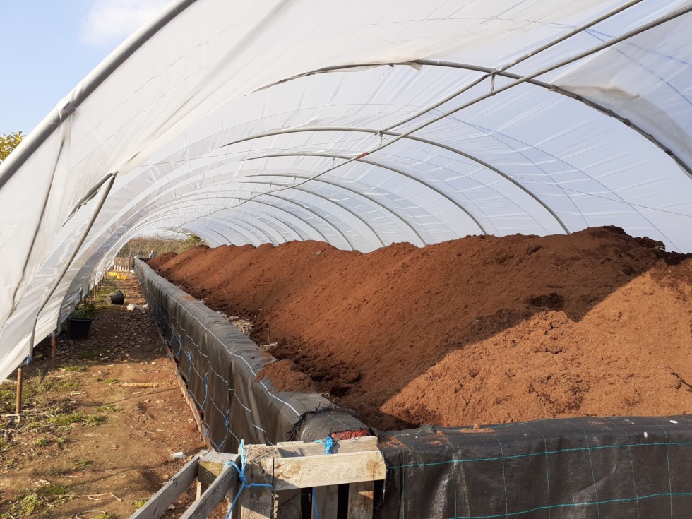 Glorious, almost windless day allowed the tunnel cladding. That's the last weather-dependent job on the new polytunnel completed. Levelling, irrigation lines and sprinklers next.